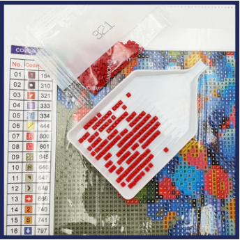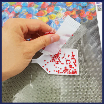 First, pick a color to start with. We recommend picking a color somewhere in the corners so that it's easier to get started. Cut open the packet and pour out the drills on the tray.