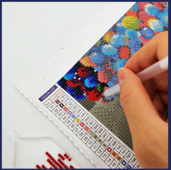 Using the wax-tipped stylus pen, pick up each drill one by one and apply it to the matching symbol on the canvas. Keep working through until the complete picture is filled in. Patience is key - it's worth it!